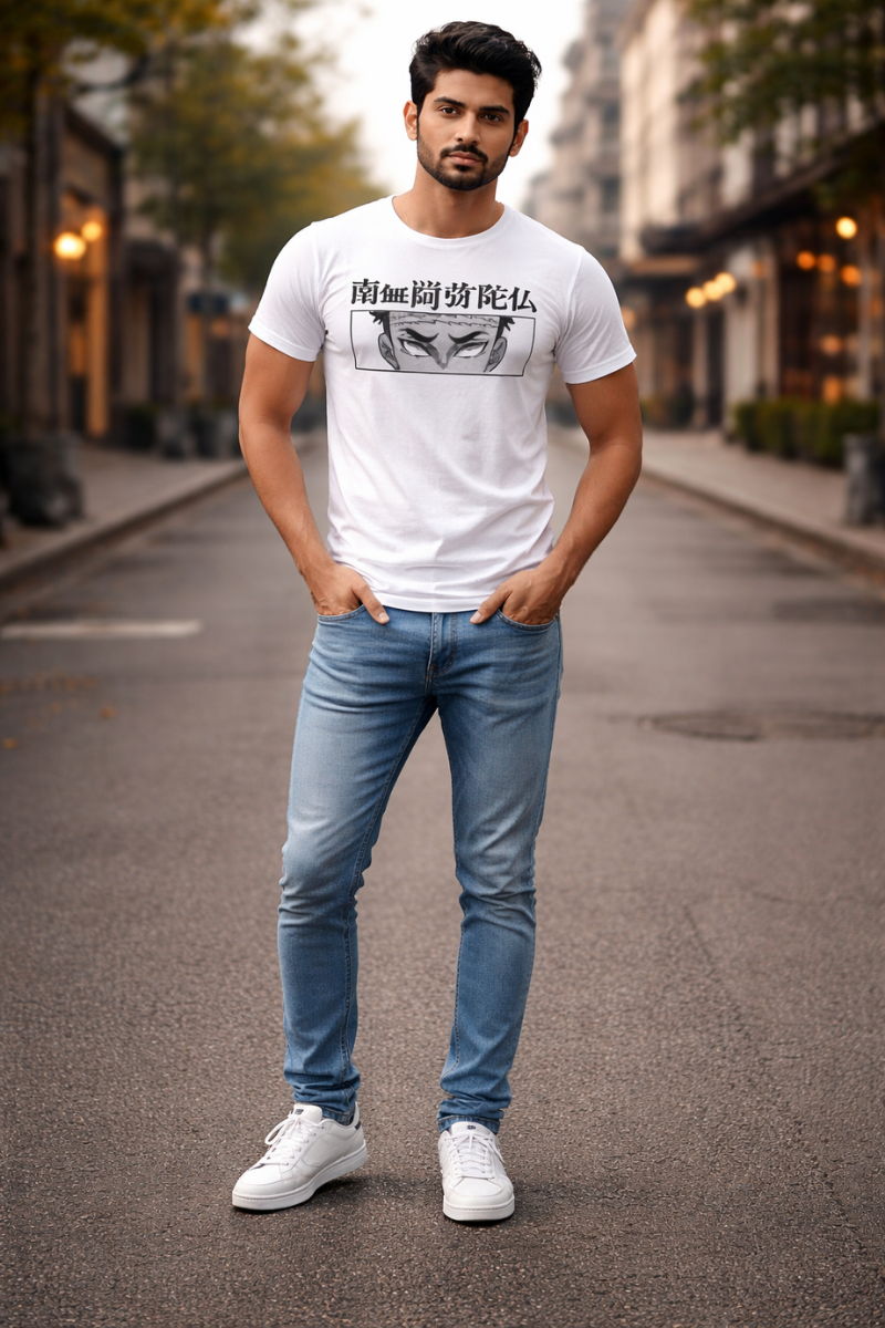 White t-shirt for men • Solid with print • Regular length • Round neck • Drop shoulder, mid length sleeves