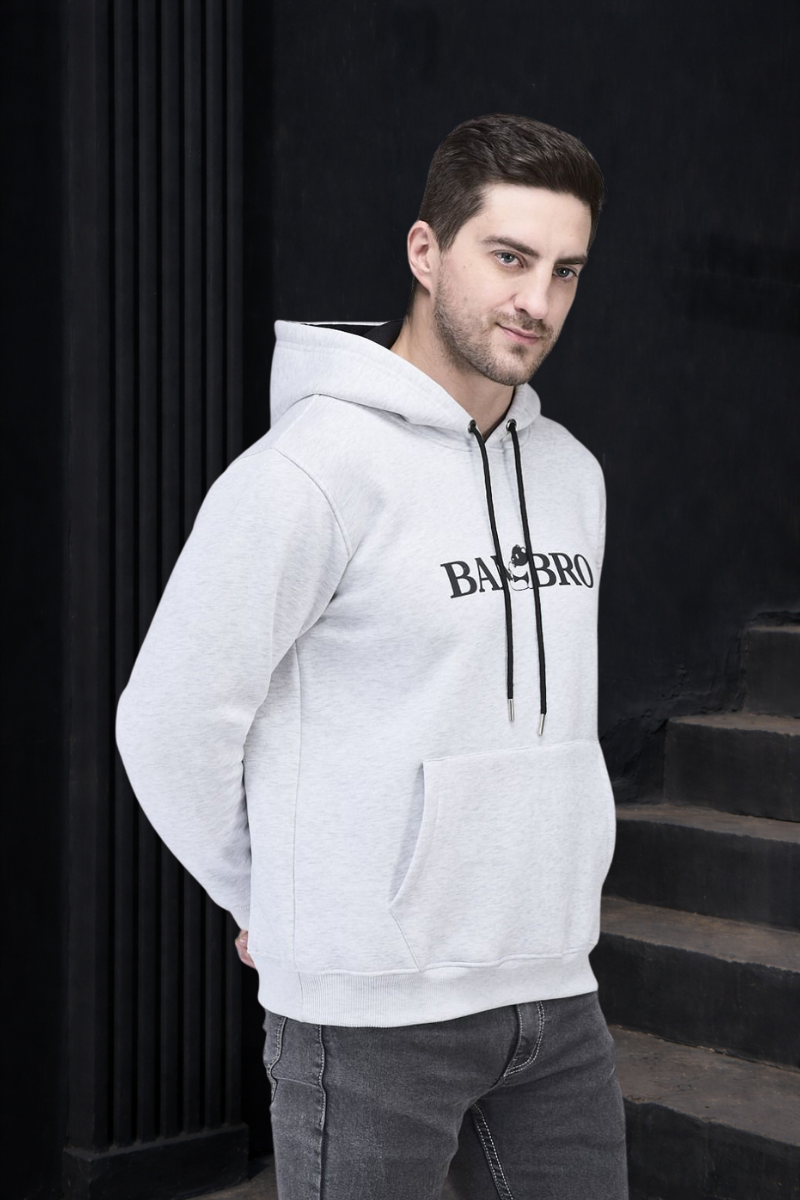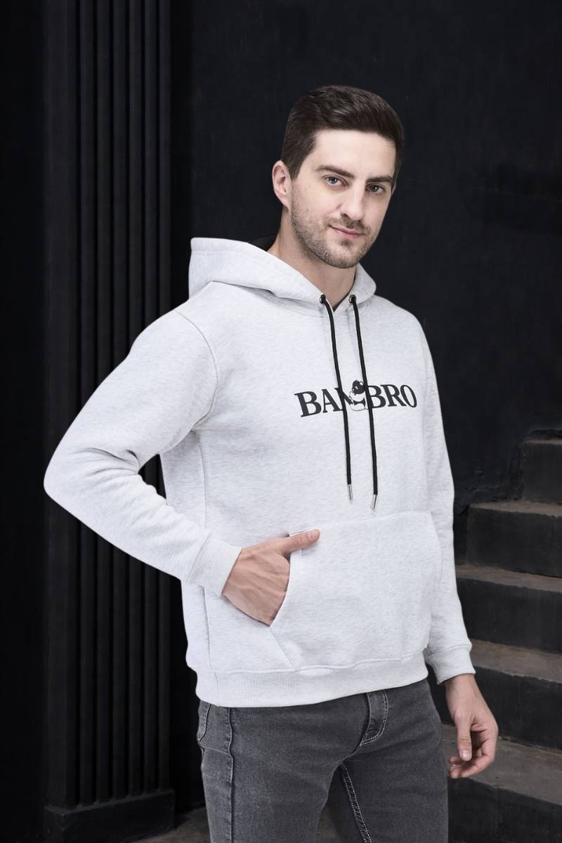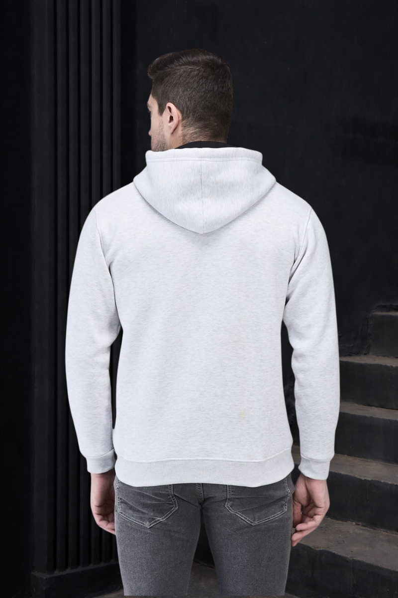 White hoodie for men • Solid with print • Regular length • Round neck • Drop shoulder, mid length sleeves