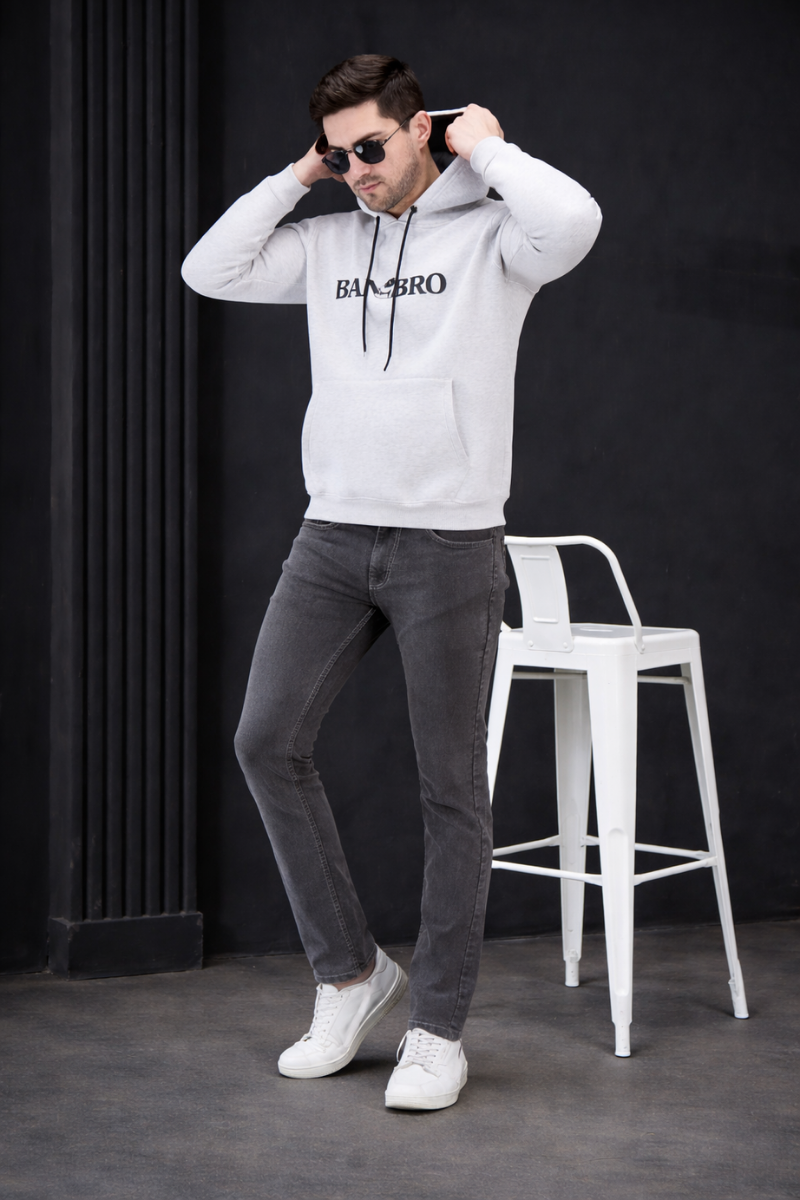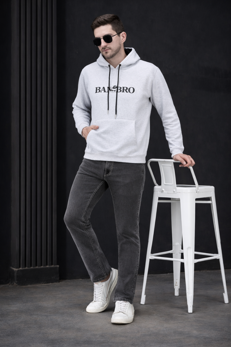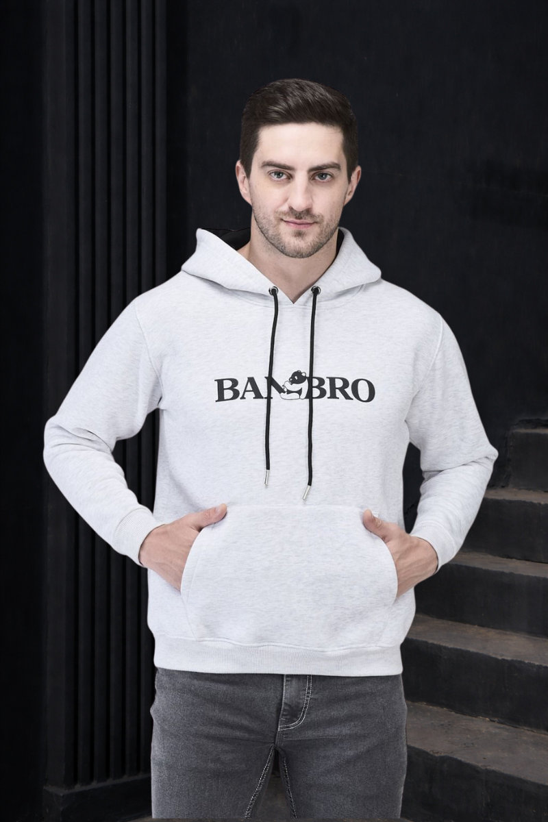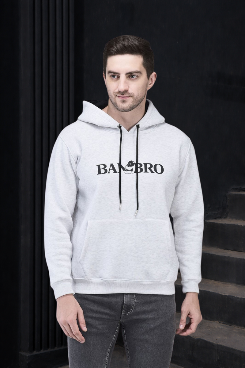 White hoodie for men • Solid with print • Regular length • Round neck • Drop shoulder, mid length sleeves