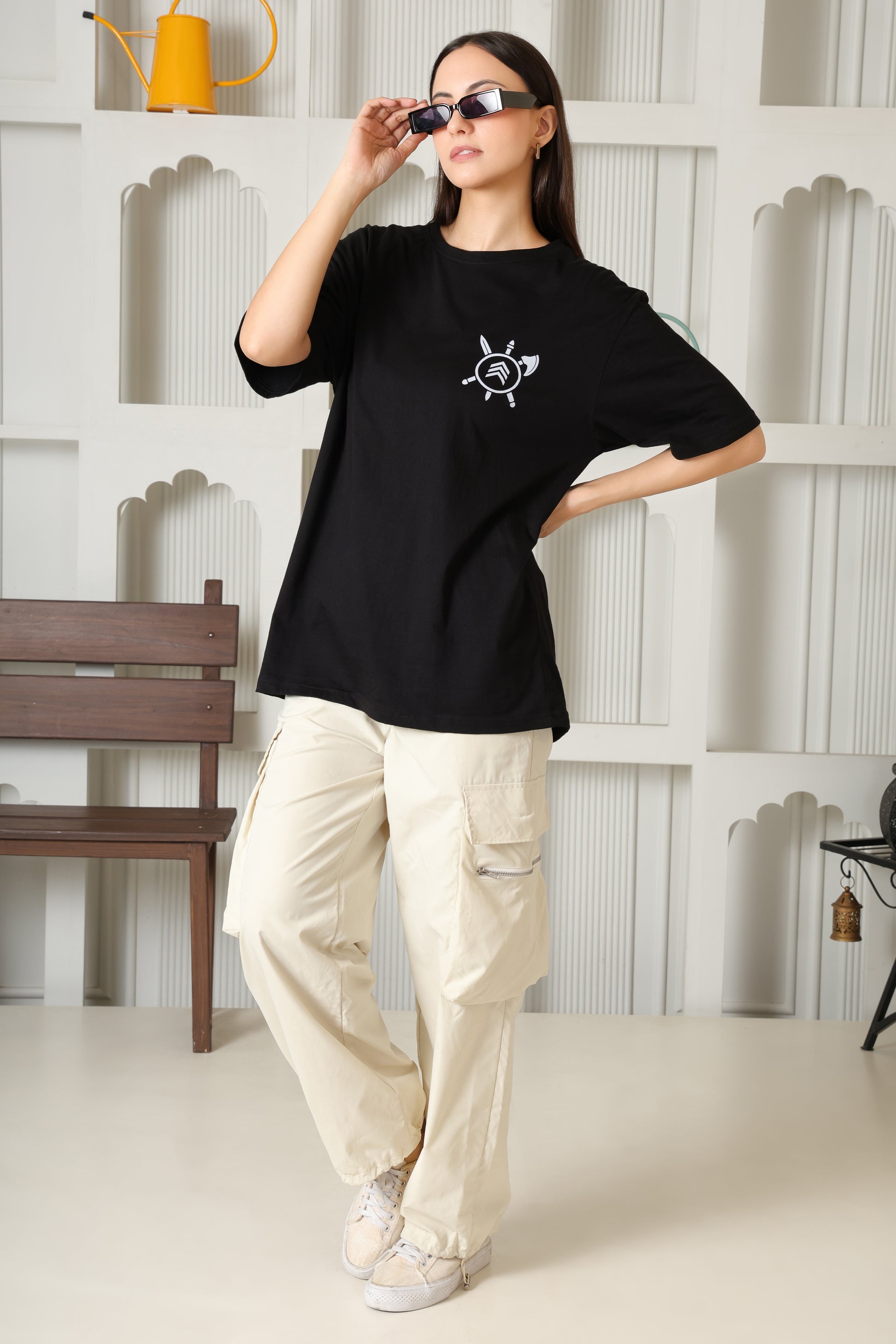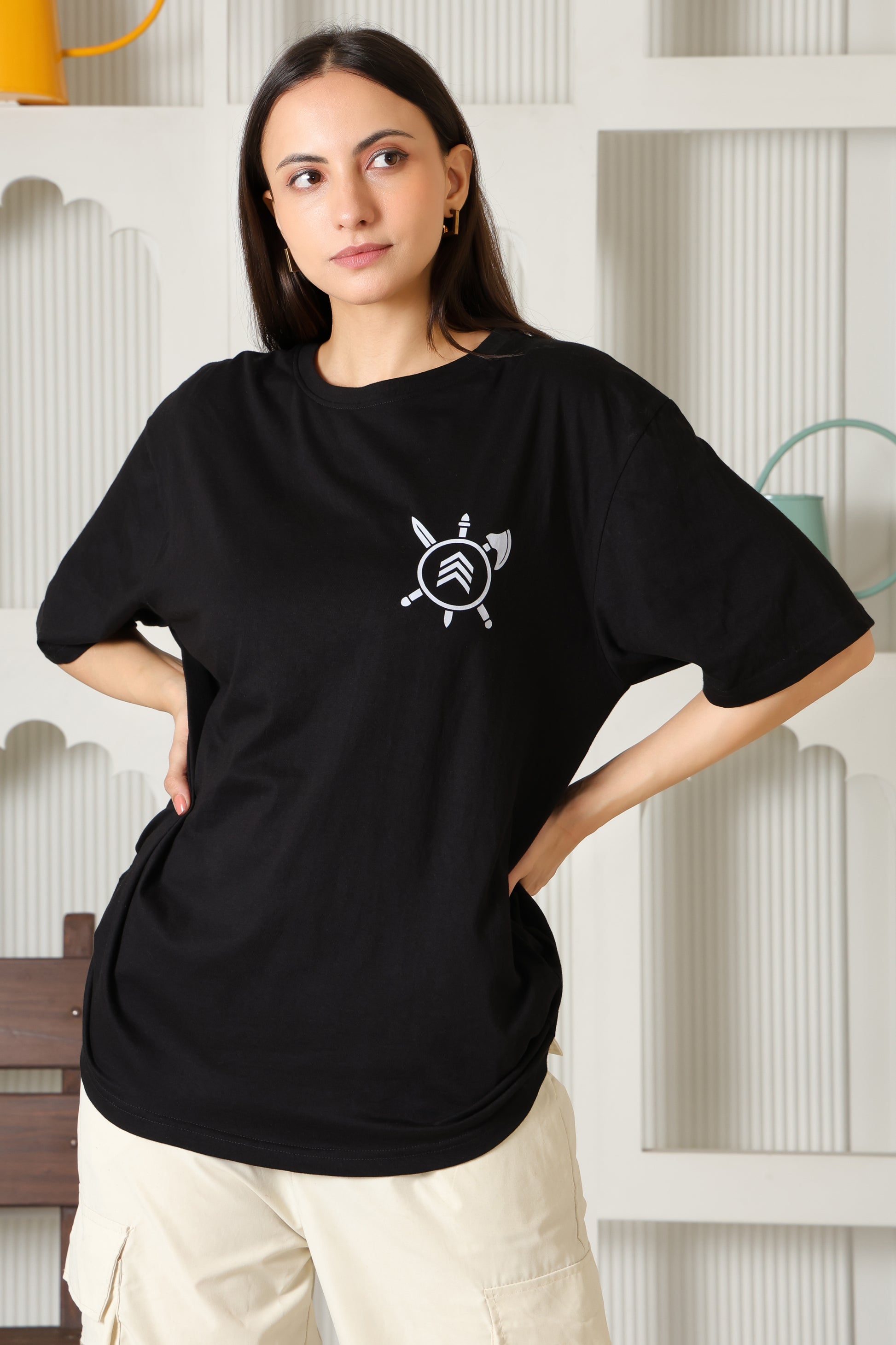 Rule the shadows with the Nightwalker Oversized Tshirt . For size reference the model is 5'6 and wearing size M.