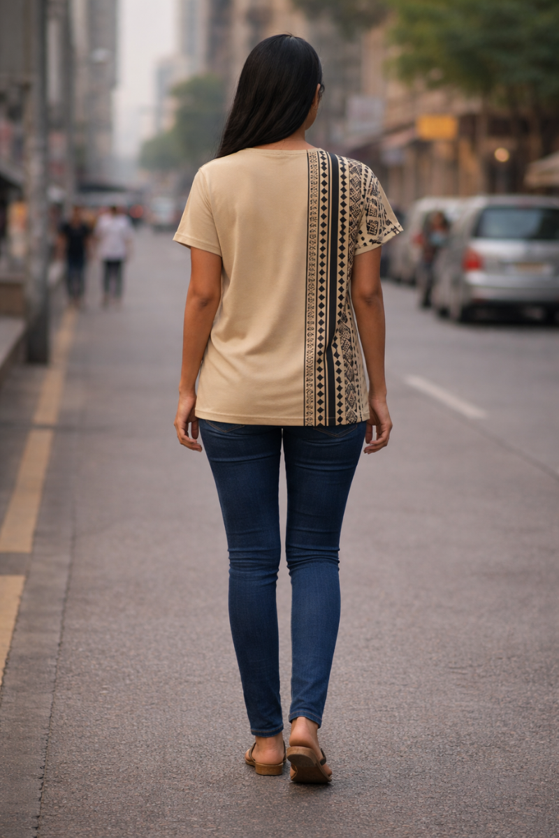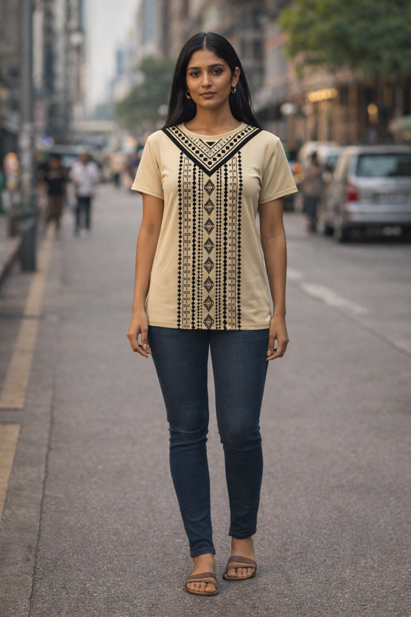 Beige t-shirt for women • Solid with print • Regular length • Round neck • Drop shoulder, mid length sleeves