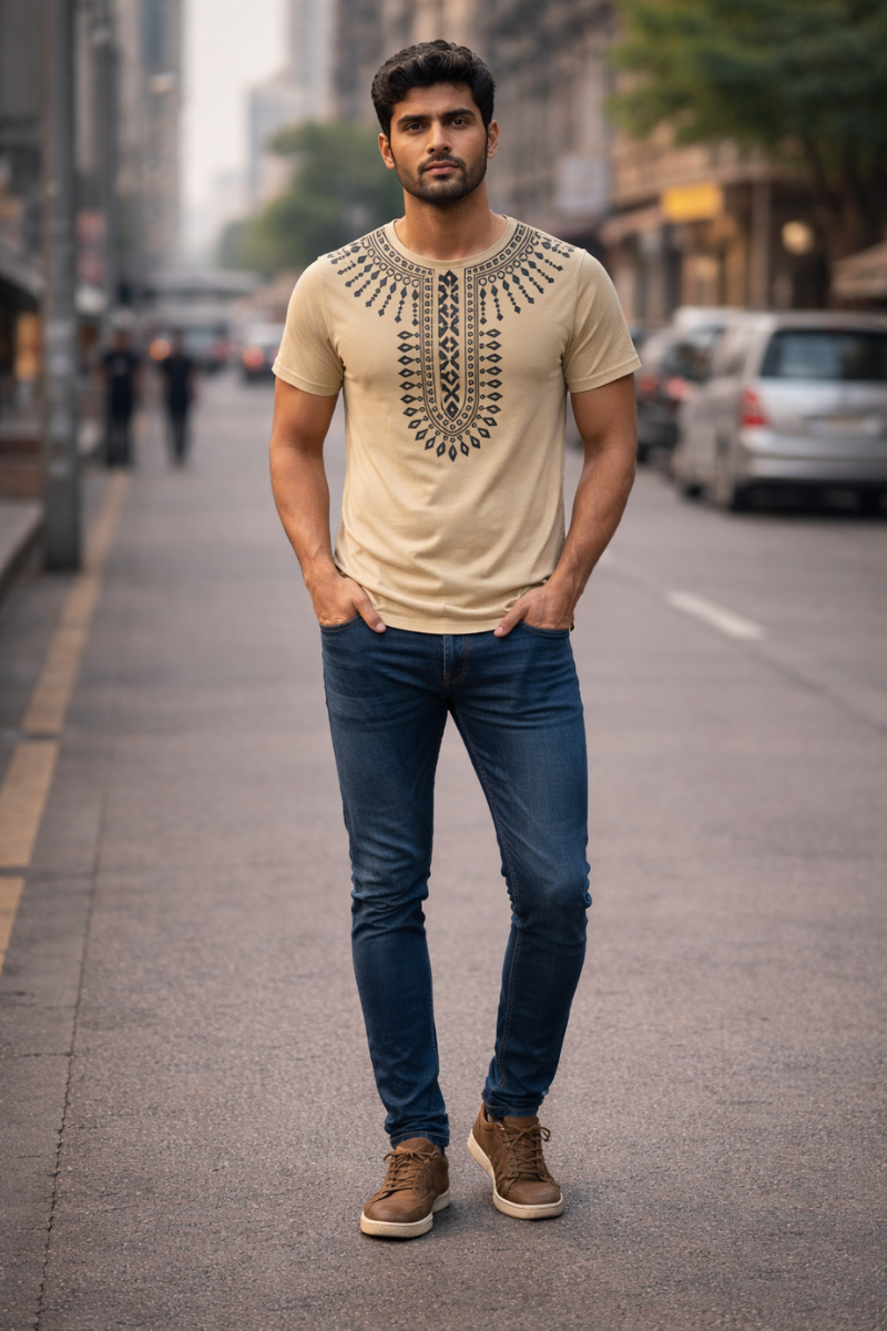 Beige t-shirt for men • Solid with print • Regular length • Round neck • Drop shoulder, mid length sleeves
