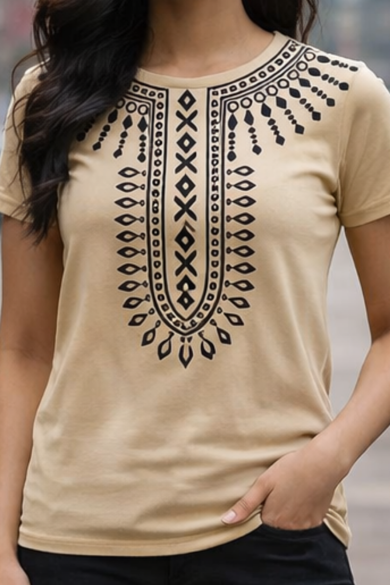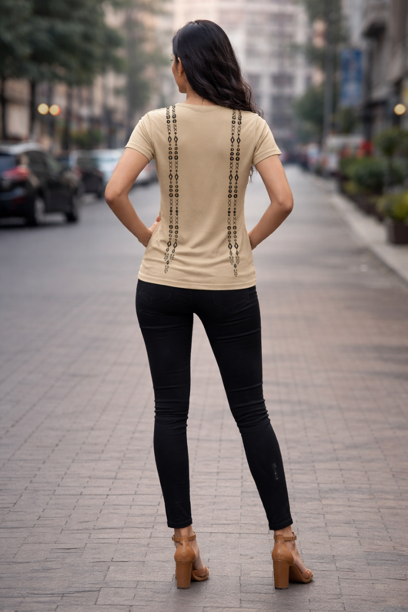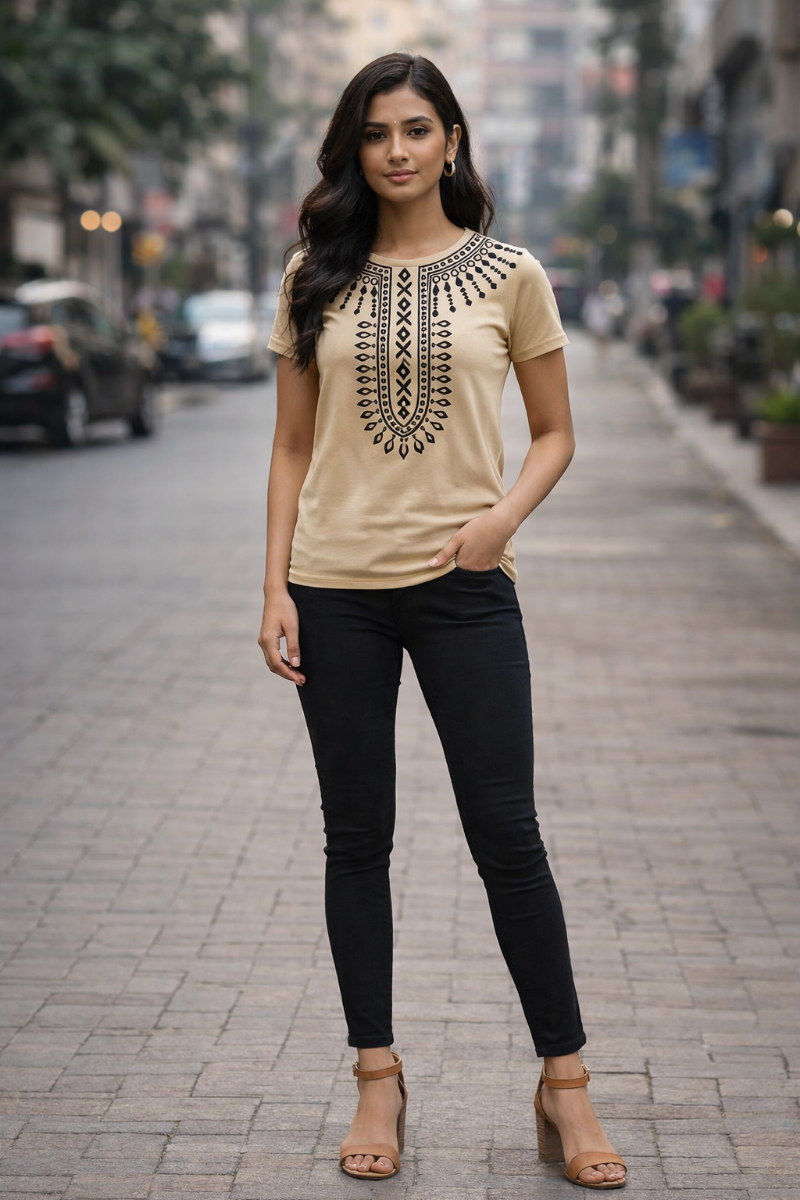 Beige t-shirt for women • Solid with print • Regular length • Round neck • Drop shoulder, mid length sleeves