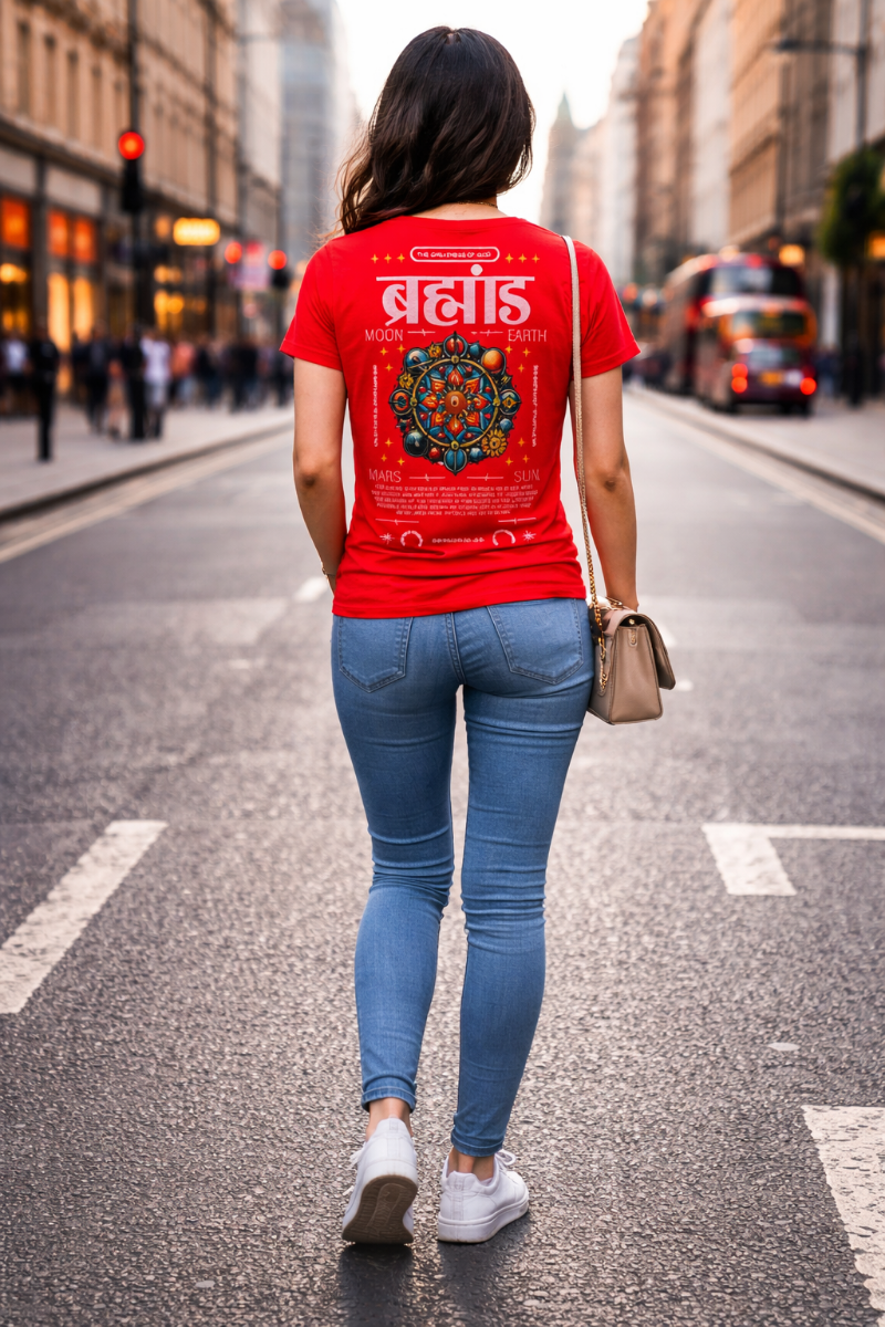 Red t-shirt for women • Solid with print • Regular length • Round neck • Drop shoulder, mid length sleeves