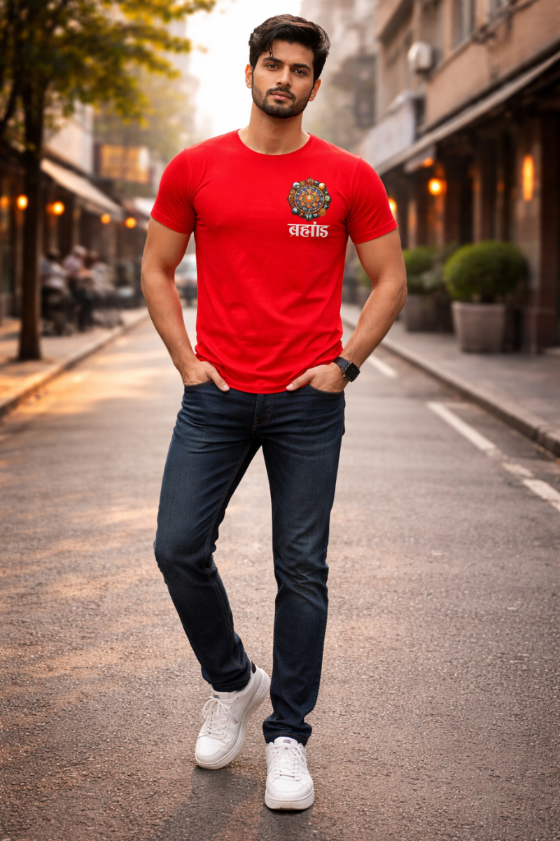 Red t-shirt for men • Solid with print • Regular length • Round neck • Drop shoulder, mid length sleeves